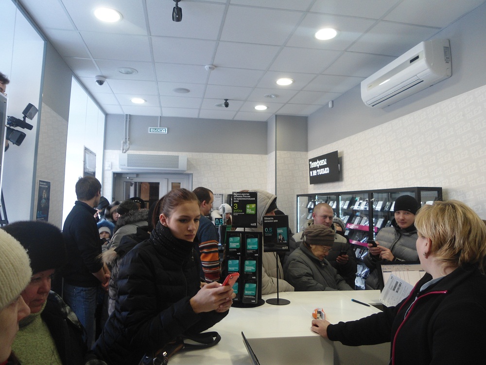Салон удивил уже на входе: вывеска салона – чёрно-белая строгая - кардинально отличалась от старого неонового стиля Tele2. Внутри салона – тот же стиль: преобладает чёрный цвет, разбавленный цветными акцентами – лаконичный, самодостаточный, впечатляющий. Я долго приглядывалась – оценивала обстановку. Чем же салон отличается от обычного центра обслуживания? Здесь продумана каждая мелочь от одежды сотрудников до организации внутреннего пространства. Я двинулась изучать витрины: красиво подсвеченные мобильные телефоны на любой вкус, карточки с услугами, тарифные коробки – всё очень красивое и всё хотелось потрогать. Особенно меня впечатлила большая интерактивная сенсорная панель (и, судя по толпе вокруг неё, не меня одну): на ней я долго и придирчиво выбирала себе номер разнообразными вариантами – то вводя желаемое сочетание цифр, то набирая красивые окончания номера, даже попробовала поиграть с умной машиной в цифровой покер. Занятие очень увлекательное.