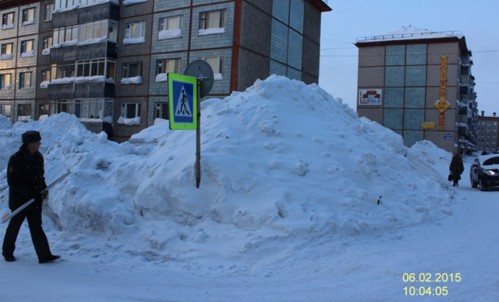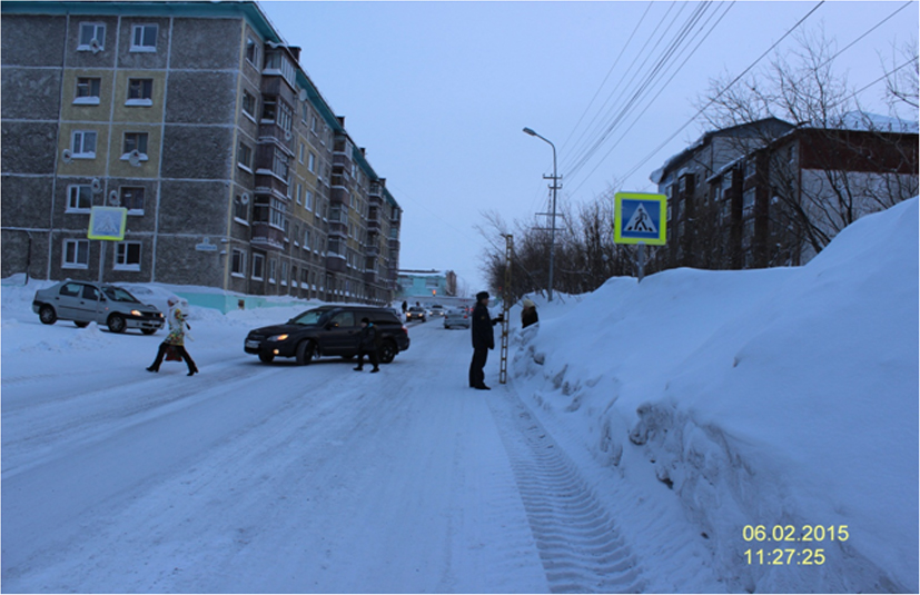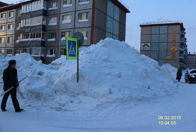 - не обеспечен треугольник видимости «пешеход-транспорт» в результате складирования снежных масс и образования сугробов (из-за выпадения осадков) высотой иногда более 2 м в границах и на подходах к пешеходным переходам;