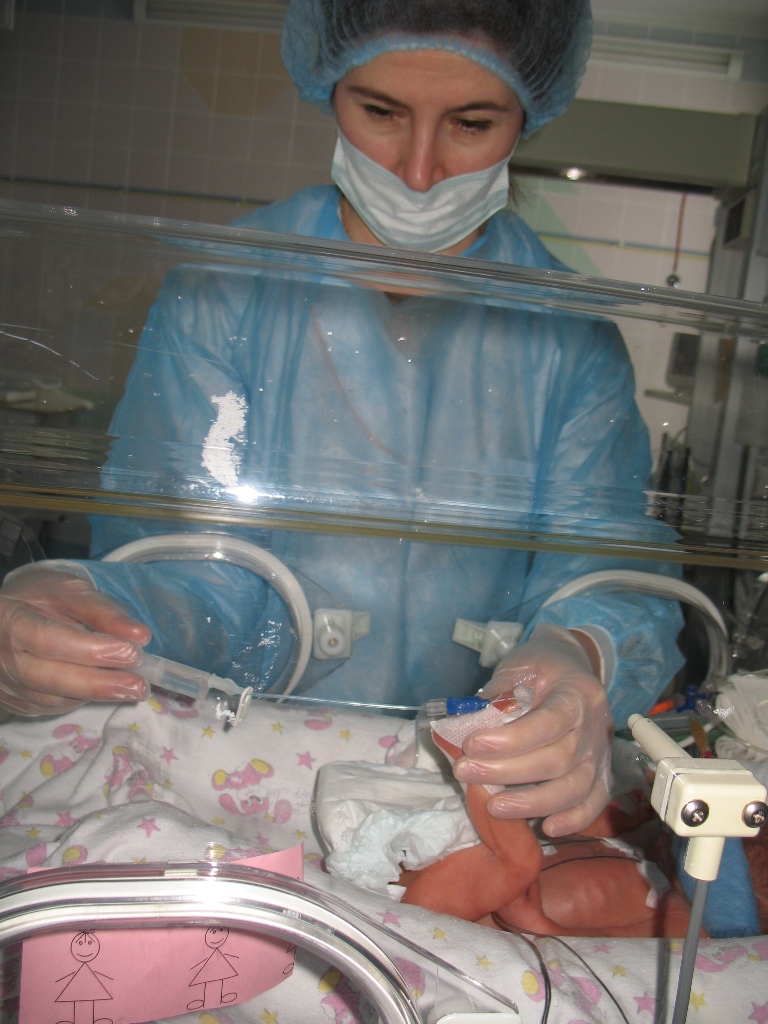 А.К. «Много пришлось пережить за эти годы. Радость ежедневных маленьких и больших побед в борьбе за здоровье наших пациентов, горечь утрат, понимание, что не над всем властен человек. И ежедневная самоотверженная работа квалифицированного персонала, как говорят в народе «на разрыв аорты» , старающихся свести процент несчастных случаев к нулю. В условиях продолжающегося снижения рождаемости развернулась настоящая борьба за каждую человеческую жизнь и за последние годы нам удалось добиться постепенного роста. Так, в 2012 году в роддоме на свет появились 1230 детей! Все эти годы мы особое внимание уделяли оснащению новыми технологиями нашей детской реанимации. Аппарат «искусственные лёгкие», подключённый к ребёнку, будет дышать за него ровно столько времени, сколько потребуется для выздоровления. Недоношенным и детям с маленьким весом при рождении жизненно необходимы особые условия. Такие малыши лежат в специальных кувезах-кроватках с пластиковым колпаком, внутри которого поддерживается постоянная температура и влажность, есть возможность постоянной подачи кислорода. Поскольку такой маленький пациент, естественно, не может пожаловаться и рассказать о своём самочувствии, очень важно непрестанно следить за показателями дыхания, сердечной деятельности, насыщением крови кислородом, пульсом, температурой. Всё это возможно при наличии современных мониторов (аппаратуры слежения). Реанимация новорождённых и особенно недоношенных – это высокотехнологичная отрасль медицины. Чем меньше ребёнок, тем более дорогим и сложным становится лечение. Реанимация новорожденных нашего роддома тоже имеет свою маленькую историю. В марте мы отметили 16 лет со дня открытия палаты реанимации. Начинали нелегко, в первую очередь, необходимо было приспособить помещение для реанимационных больных. Что-то удавалось своими силами, но ремонт палат, проводка электричества и подачи кислорода могли сделать только специалисты. Вот тогда к нам на помощь пришли работники ЦРСУ «Воркутауголь». Благодаря им в короткие сроки удалось приготовить нужные площади. Тогда же министерство здравоохранения республики выделило инкубаторы, дыхательную аппаратуру и мониторы. Именно после оснащения отделения реанимации, впервые за многие годы, резко снизилась смертность среди новорожденных -более, чем вдвое. Появился шанс выжить и расти здоровыми у многих малышей, особенно у недоношенных. За эти годы многое изменилось, медики накопили достаточный опыт лечения новорожденных, создается все более совершенная дыхательная аппаратура, инкубаторы и мониторы. К примеру, в этом году в отделении реанимации новорожденных появился электроэнцефаллограф. Он показывает, как работает головной мозг у малыша. Такой аппарат просто необходим для точной диагностики недоношенных деток.
