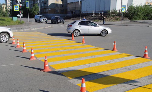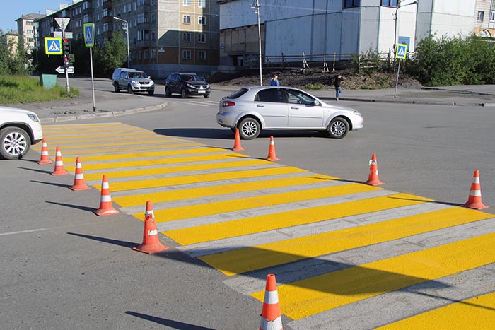 НА ПЕШЕХОДНЫЕ ПЕРЕХОДЫ ВОРКУТЫ НАНОСЯТ ЖЕЛТУЮ РАЗМЕТКУ