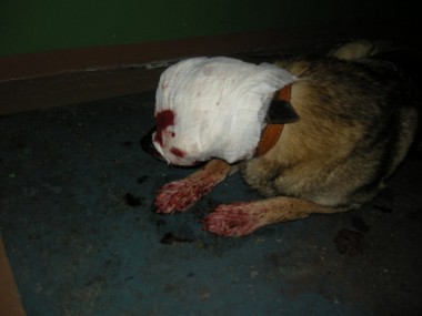 Собаку, истекающей кровью в подъезде, быстро отыскали добровольцы Воркутинского общества защиты бездомных животных и просто люди с большими и добрыми сердцами, так быстро откликнувшиеся и не оставившие в беде умирающее животное. Малышу (так назвали собаку жители района ул. Дончука) сразу на месте оказали первую помощь, благодаря чему он остался жив!