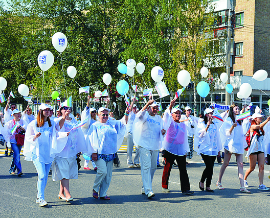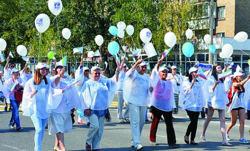 Участники парада демонстрировали горожанам свои национальные наряды и гербы городских и районных образований.