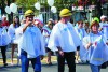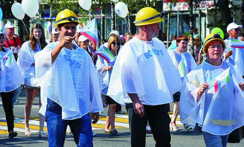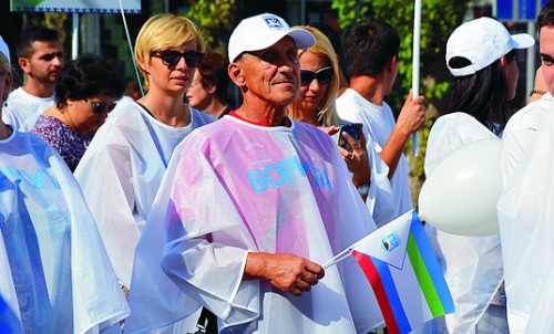 Следом гордо шла Инта. Интинцы, обличенные в синий цвет, несли растяжку с надписью "Инта - золотое сердце Коми". В этом муниципалитете ведущими отраслями являются добыча угля и электроэнергетика.