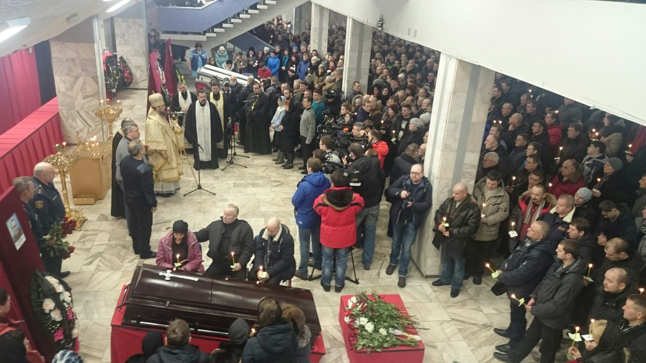 Отпевание и панихида проходят в Универсальном спортивном комплексе "Олимп". Несмотря на непогоду, из-за которой в Воркуте отменены занятия в школах и ссузах, проститься с шахтерами пришли тысячи горожан: очередь в фойе "Олимпа" растянулась на сотни метров.