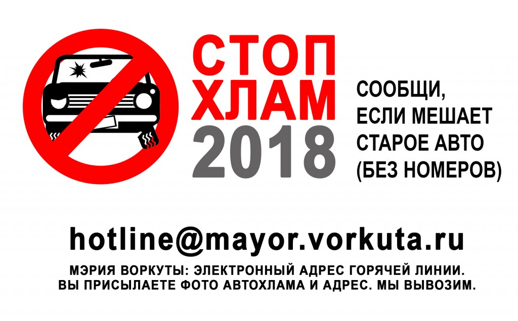 Участие в акции СТОП-ХЛАМ могут принять все неравнодушные воркутинцы. Для этого достаточно на электронный адрес горячей линии hotline@mayor.vorkuta.ru прислать адрес и фото автохлама без номеров, который находится во дворе. –