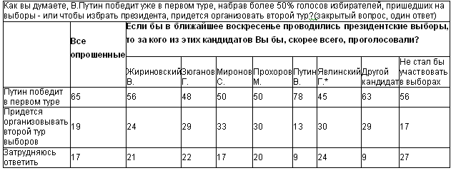 Большинство россиян убеждены, что на президентских выборах В.Путин одержит победу в первом туре (65%). Это мнение наиболее характерно для его сторонников (78%), однако и те россияне, которые поддерживают других кандидатов (48-63%), и абсентеисты (56%) склонны придерживаться этой же позиции.