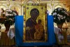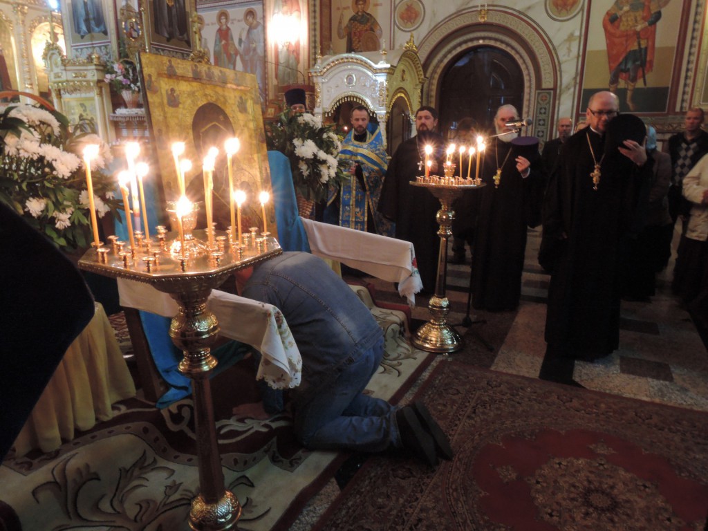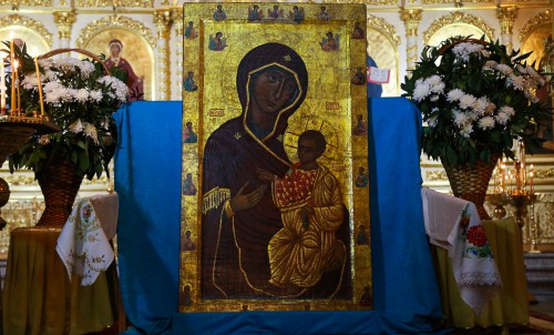 Образ, написанный на массивной деревянной доске афонскими монахами-иконописцами водрузили в центр храма на приготовленное место, украшенное живыми цветами. На доске в золоте и бронзе на каждого взирала Богородица со Святым младенцем на руках, на раме иконописцы изобразили свидетелей ее земной жизни - двенадцать апостолов, один из которых - Лука - позже увековечил ее лик на иконе. Владыка Питирим облачился в епитрахиль голубого цвета, после чего начал ночную праздничную службу.